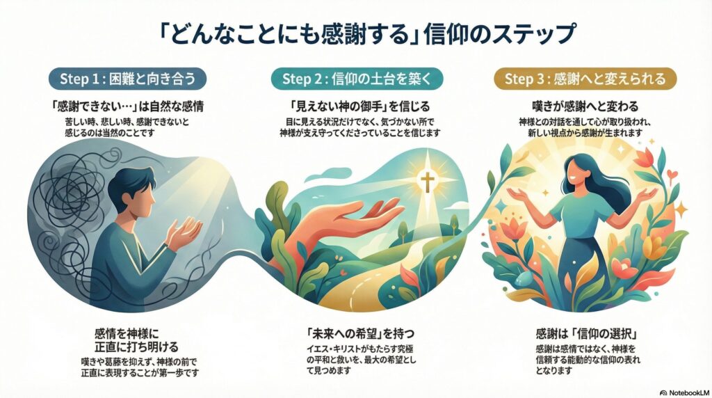 つまり、神様の前での正直な葛藤そのものが、感謝への扉を開けるための鍵となるのです。