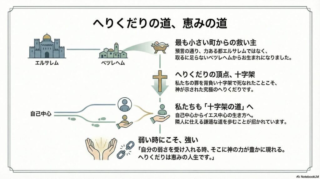 取るに足らない村から生まれるという事実は、救い主の生涯を貫くテーマの、壮大な序章に過ぎませんでした。第二の洞察は、彼の本質が「謙り(へりくだり)」という概念に集約される点です。