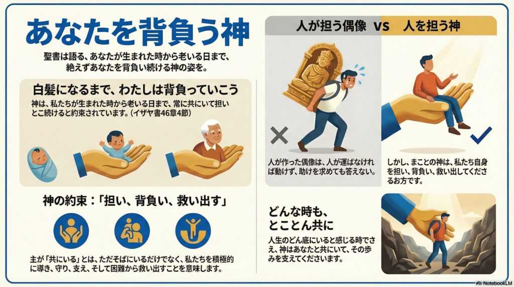 イザヤ書は、神が「生まれた時から」「胎を出た時から」人々を担ってきたと述べ、そのサポートが人生の終焉まで続くことを、具体的かつ感動的な言葉で保証する。