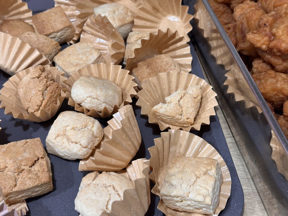 - お食事・スイーツ: ボリュームたっぷりのサンドイッチ、揚げたての唐揚げ、サクサクのスコーン